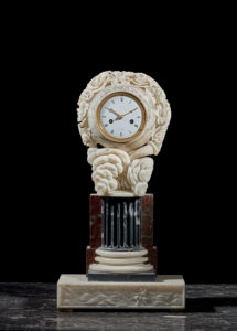 Pendule, dite à l'”Hommage au capitaine MARION-DUFRESNE” en marbre blanc, noir et rouge veiné, Paris, vers 1790. Cadran émaillé montée sur une colonne dorique noire, décor sculpté en marbre blanc représentant des volutes de brume se...