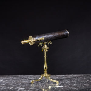 Claude Simeon PASSEMANT (1702-1769) Téléscope à réflexion en bronze et laiton, corps gainé de cuir noir. Pied tripode dévissable laissant apparaitre une queue de cochon pour fixer l'instrument sur un arbre. Signé : « PASSEMANT ingénieur du...