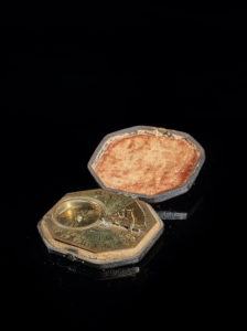 Jean Baptiste Nicolas DELURE (actif en 1696 - mort en 1736) Cadran solaire octogonal de poche en laiton gravé, style axe à l'oiseau. Dans son écrin. Signé DELURE, à Paris. L. 7 cm