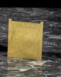 Petit cadran solaire dit quadrant horaire (quart de cercle à 90°) en laiton doré de forme carrée, pour la latitude 47 et demi (Blois), table ombre verse et ombre droite. France, fin XVIe siècle/début XVIIe siècle 5 x 6 cm