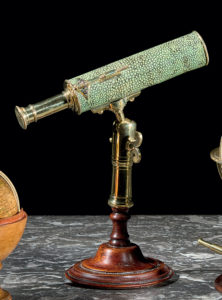 Rare télescope à réflexion miniature en bronze et laiton, corps gainé de galuchat vert. Pied à rotule reposant sur une base circulaire en acajou. Complet de ses optiques et deux miroirs. Bon état de marche. France, XVIIIe siécle L. 19 cm