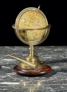 Petit globe terrestre de salon Monture méridionale et équatoriale en laiton poli. Lunette à deux tirages reposant sur la base du globe. Socle en acajou. Signé DELAMARCHE, rue serpente à Paris. France, XIXe siécle H. 19 cm Diam. 8 cm