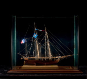 Frégate française La Toulonnaise, la Goélette, 1823 en bois deux mats à sec de voile, sous vitrine de présentation. Travail d'amateur, seconde moitié du XIXe siècle 63 x 71 cm