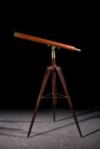 Longue vue de parquet en bronze et laiton. Corps gainé de cuir fauve. Pied tripode repliable en bois verni avec tube central de réglage des hauteurs. Signée sur le pourtour de l'oculaire : BURON. Opticien. Quai d'Orléans 38 Lyon. France, début...