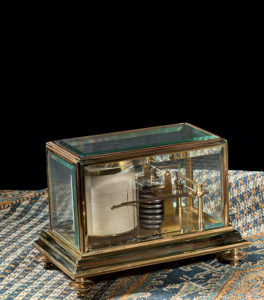 Baromètre enregistreur en bronze et laiton à 6 capsules de Vidi. Cage de protection à 5 verres biseautés, monogramme sur la terrasse PB et HN pour NAUDET et PERTUIS, fabricants de baromètres de 1860 à 1900. Parfait état de marche.