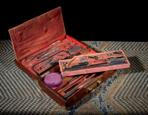 Louis MATHIEU (1817-1879) Coffret de chirurgien de la marine sur trois niveaux. La grande majorité des instruments signés du fabricant. Coffret en acajou renforcé de laiton portant la signature de MATHIEU sur toutes les ferrures et serrures....