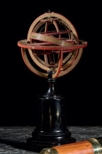 DELAMARCHE Sphère armillaire de type ptolémaïque en bois, carton et papier gravé souligné de rouge. Type Ptolémée avec au centre la terre. Pied en bois tourné noirci. France, début XIXe siècle H. 31 cm Diam. 14 cm