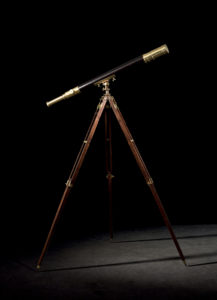 Louis HUET (1756-1805) Lunette de parquet en laiton, corps gainé de cuir noir. Molette latérale pour un réglage fin. Pied tripode repliable avec système de réglages des hauteurs et de la latéralité par vis sans fin. Forte optique. Signée...