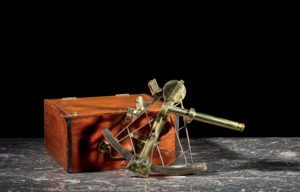 Sextant en bronze poli. Platine à croisillons, trois optiques. Coffret de transport Fabricant à Liverpool (signature peu lisible) XIXe siècle H. 23 cm
