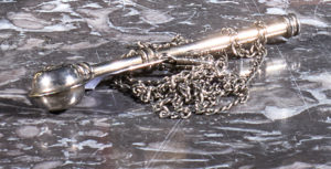 Sifflet de quartier maitre en laiton chromé, modèle au tonneau frappé de l'ancre. Chaine tour de cou. France, XIXe siècle