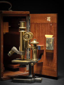 Microscope en laiton doré et bronze patiné marqué Carl ZEISS JENA, numéroté 229088 et ses accessoires. Boîte de transport en acajou. Fin XIXe siècle H. 27 cm Carl ZEISS (1816-1888) Carl Friedrich Zeiss est né le 11 septembre 1816 à Weimar,...