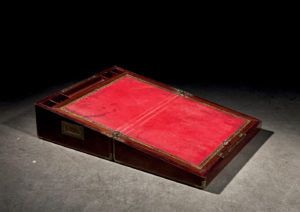 Grand écritoire de voyage en acajou avec renforts de laiton. Intérieur gainé cuir. Fabrication anglaise, fin XIXe siècle Dim. ouvert 70 x 55 cm