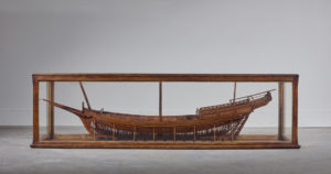 Maquette de chantier de Chebeck en bois fruitier, coque bordée, sur membrures, coupes apparentes pour l'instruction pont arrière sculpté. Vitrine de présentation. Fin XIXe siècle H. 32 cm L. 120 cm P. 33 cm