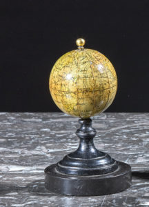 Petit globe terrestre monté sur un pied en bois noirci et une terrasse en marbre noir de stabilité. Monogrammé J.L. (Jules Lebégue), à Paris. France, fin XIXe siècle H. 13 cm Diam. 6 cm