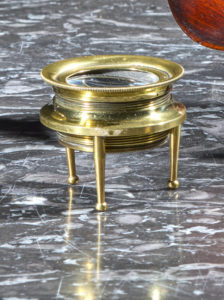 Loupe compte-fil en laiton sur un pied tripode. Réglage optique par vissage. France, début XXe siècle
