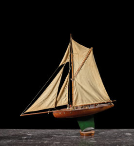 Jouet de bassin « voilier » en bois peint, voile en tissu avec gréement, pont détaillé, quille métal. Circa 1920 L. 90 cm
