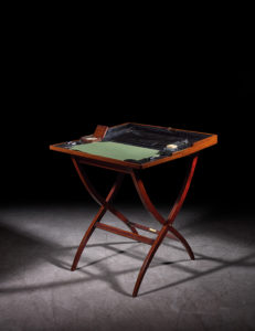 Bureau de voyage repliable en acajou enrichi de filets blonds. Intérieur gainé de cuir noir avec rangements, sous-main encrier et boussole. Signé sur une plaque en os et indiqué : Importé d'Angleterre. H. fermé 90 cm L. 60 cm P. 60 cm