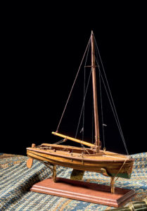 Maquette de dériveur A sec de toile, coque bordée à clins dérive laiton, socle de présentation. Début XXe siècle L. 39 cm