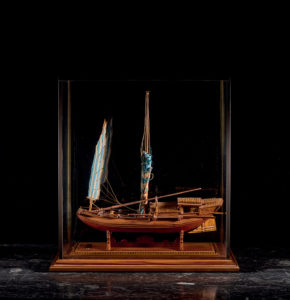 Jonque en bois et marqueterie de paille, sous vitrine de présentation. Travail d'amateur seconde moitié du XXe siècle 59 x 50,5 cm