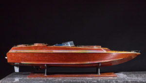 Grande maquette de hors bord en acajou et bois blond, Ber de présentation. France, XXe siècle L. 130 cm P. 40 cm Moteur et télécommande semblant en bon état mais non essayé.
