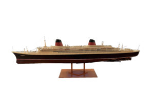 Maquette du Paquebot France en bois laqué, vernis et plastique, complète de ses canots, matures. L. 155 cm environ. (Accidents)