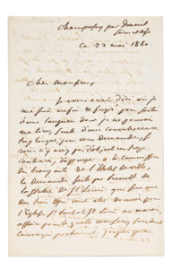 DELACROIX Eugène (1798-1863) L.A.S. « Eug. Delacroix »,Champrosay 22 mai 1860, [à Henri DELABORDE ?] ; 2 pages et demie in-8. Réfugié à la campagne pour se remettre d'une « convalescence trop longue », Delacroix prie son correspondant «...