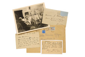 pouvoir sortir un jour où l'on aime à serrer la main de ses amis. J'espère que ma santé me permettra de vous revoir chez Dussez »... On joint une carte signée (montée sur carte, trous de classeur), au sujet du prix de son tableau Kämpfender Krieger, dont il remonte le prix de 2.400 à 3.000 marks. Plus une photographie (contretype) de Hodler peignant dans son atelier le portrait de Navazza, avec lettre d'envoi de la fille de Navazza.