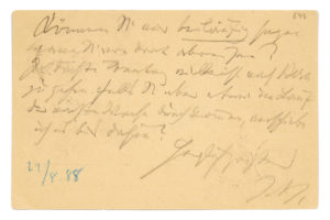 BRAHMS Johannes (1833-1897) L.A.S. « J. Br », [Thun 22 août 1888], à son ami et éditeur Fritz SIMROCK à Gurnigelbad ; 1 page oblong in-12 au crayon, adresse à l'encre au dos (Postkarte) ; en allemand. Il voudrait savoir quand Simrock partira....