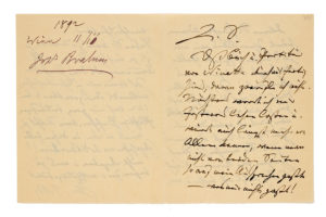 BRAHMS Johannes (1833-1897) L.A.S. « J Br », [Vienne 11 novembre 1892], à son ami et éditeur Fritz SIMROCK à Berlin ; 3 pages in-12 ; en allemand. Au sujet de Johann Strauss. [Simrock avait demandé l'avis de Brahms sur la prochaine opérette de...