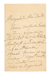 LISZT Franz (1811-1886) L.A.S. « F. Liszt », « Wien (Schottenhof) » 27 octobre 1884, à « Hochgeehrter Herr Doctor » : 2 pages in-8 ; en allemand. Comme un prestidigitateur annonçant un tour bien connu (« dem bekannten Kunstgriff der...