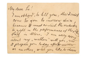 MAHLER Gustav (1860-1911) L.A.S. « Gustav Mahler », [Hambourg vers 1892-1897], à Sir Augustus HARRIS ; 2 pages oblong in-12 ; en anglais. Il ne pourra venir dîner le lendemain, car il doit diriger l'orchestre pour la représentation de la Flûte...