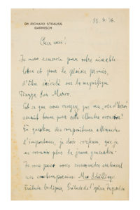 STRAUSS Richard (1864-1949) L.A.S. « Richard Strauss », Garmisch 18 juin 1936, à un ami italien ; 2 pages in-8 à son en-tête Dr. Richard Strauss Garmisch ; en français. Au sujet d'un concert à Venise. Il se réjouit « d'être exécuté sur la...