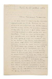 BRETON André (1896-1966) L.A.S. « André Breton », Paris 29 juillet 1957, à Bernard POISSONNIER ; 1 page et demie in-8. Au sujet de Giorgio de CHIRICO. « Ce que vous m'apprenez des derniers agissements de M. de Chirico ne me surprend aucunement....