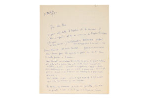 COCTEAU Jean (1889-1963) L.A.S. « Jean », 3 octobre 1954, à son ami l'égyptologue René BERTRAND ; 2 pages in-4. Il cite un « étude photographique sur la mémoire du sang. [...] Jamais on ne réunira assez d'hommes pour ôter une couche de...