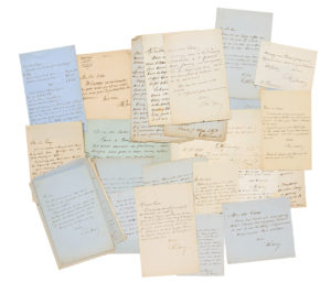manuscrits, de leur copie, de demandes d'argent, de leurs comptes, du paiement de billets, de ses collaborateurs (« Ayant un collaborateur qui me fait mes recherches, j'ai deux tiers et non pas un tiers »), du paiement de Maquet (une lettre est écrite à la suite d'une demande de Maquet), de son « traité verbal » avec Bruxelles, d'un envoi de volumes à la Princesse Mathilde ; de ses ouvrages Geneviève, Les Mille et un Fantômes (sur lequel Paul Lacroix doit toucher 300 F), Le Collier de la Reine, Louis XIV, Louis XV, Louis XVI,Le Médecin de Java, Ingénue, de ses pièces Le Secrétaire intime pour la Gaité et Le Pirate pour les Variétés ou le Gymnase ; etc. 10 novembre 1850, il engage sa parole d'honneur de donner à Cadot « l'édition compète de mes OEuvres illustrées » en édition populaire... - Bruxelles 7 avril 1853, sur ses Mémoires : « Voulez-vous que je les fasse pour vous à deux mille francs. Vous les vendrez à la Presse ou au Siècle ou vous les publierez inédit à la manière dont c'est lancé je suis sûr que vous feriez une bonne affaire en interrompant la publication quotidienne en annonçant que vous publierez deux volumes par mois »... On joint 4 reçus a.s. (dont un pour les Mémoires d'un médecin) ; 10 l.a.s. d'Auguste MAQUET (et un reçu a.s. « pour ma part du manuscrit des Mousquetaires ou de la Guerre des femmes », 27 mars 1850) ; 4 l.a.s. de Noël PARFAIT (Bruxelles septembre-décembre 1853).