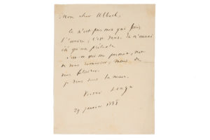 HUGO Victor (1802-1885) L.A.S. « Victor Hugo », 29 janvier 1885, à Louis ULBACH ; 1 page petit in-4 (infime fente restaurée). « Ce n'est pas moi qui fais l'oeuvre, c'est vous. Je n'aurai été qu'un prétexte. C'est ce qui me permet, non de vous...