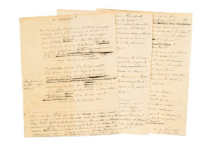 1831 » et présente des ratures et corrections. Ce beau et vigoureux poème a été écrit en réponse à une poésie satirique d'Auguste BARTHÉLEMY parue dans la Némésis du 3 juillet 1831 : A M de Lamartine, candidat à la députation de Toulon et de Dunkerque. Le poème de Lamartine, A Némésis, a été publié dans le journal L'Avenir du 20 juillet (coupure jointe), avant de paraître en plaquette chez Gosselin avec une note explicative dont nous avons ici la première version : « Le 2e n° du journal (en vers) la Némésis contient une satyre aussi amere qu'injuste contre M. de Lamartine. On lui reproche entre autres l'usage le plus légitime des droits du citoyen, l'honorable candidature qu'il avait acceptée dans le département du Nord ; on semble lui interdire de prononcer le mot de liberté ; on lui reproche aussi d'avoir reçu de ses libraires le prix de ses ouvrages. Cette satyre répandue avec profusion le jour de l'élection a dit-on contribué beaucoup à lui enlever les 8 voix qui lui ont manqué pour la deputation ». Le manuscrit, avec des ratures et corrections, présente des variantes par rapport au texte publié. « Non, sous quelque drapeau que le Barde se range La Muse sert sa gloire et non ses passions ! Non, je n'ai pas coupé les ailes de cet ange Pour l'atteler hurlant au char des factions ! Non, je n'ai pas couvert d'un masque populaire Son front resplendissant des feux du saint parvis,Ni pour fouetter et mordre irritant la colère Changé ma Muse en Némésis ! »...