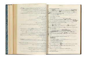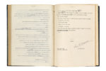 et dos un peu frottés), sous emboîtage de papier « serpent » lie de vin avec fenêtre et reproduction de la jaquette du roman, titre au dos (Thérèse Treille). Tapuscrit complet, très corrigé par l'auteur, de ce roman policier. Il est daté en fin « Shadow Rock Farm, Lakeville (Connecticut), 21 février 1951 », et signé par l'auteur. Le roman a été publié pour la première fois en juillet 1951, aux Presses de la Cité. Après un vol dans une boîte de nuit à Montparnasse, la police surveille l'hôtel meublé de la rue Lhomond où logeait le voleur, le jeune Émile Paulus ; pendant la planque, l'inspecteur Janvier, bras droit de Maigret, est blessé d'un coup de revolver. Maigret décide alors de s'installer dans l'hôtel meublé, au sein du quartier Mouffetard, pour mener lui-même l'enquête... Toutes les pages de ce tapuscrit, soigneusement dactylographié par Simenon lui-même, portent de nombreuses corrections autographes, à l'encre noire ou turquoise, pour changer des mots, parfois une phrase entière. On joint l'édition originale : Maigret en meublé (Paris, Presses de la Cité, 1951), in-8, broché, couverture noire laquée illustrée d'une photographie ; il n'y a pas de grands papiers. Chemise et étui de papier noir de Thérèse Treille, titre en jaune sur le dos de la chemise. PROVENANCE Sven NIELSEN ; collection J.-M B. Georges Simenon (Sotheby's Paris, 24 juin 2003, nos 96-97).