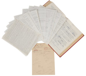 Plus le TAPUSCRIT original avec CORRECTIONS autographes et signé ; [1]-171 pages in-4, reliure de basane rouge à décor de filets et pointillés estampé à froid (mors un peu frottés, charnière fatiguée, petites éraf lures). Sous deux emboîtages uniformes de papier « serpent » lie de vin avec fenêtre et reproduction de la jaquette du roman, titres au dos (Thérèse Treille). Ensemble exceptionnel permettant de suivre toute la genèse de ce roman américain, depuis sa conception et le plan sur l'enveloppe jaune, le manuscrit de premier jet, et le tapuscrit corrigé. Écrit en décembre 1951 à Lakeville (Connecticut), à Shadow Rock Farm où Simenon s'est installé en 1950, La Mort de Belle est un « roman indispensable qui doit figurer dans la liste des livres étapes. [...] le corps de la jeune Belle Sherman est découvert au domicile des Ashby. C'est sur le mari, professeur d'histoire, que se portent les soupçons. La présomption de culpabilité en fait un pestiféré. Tandis que l'enquête piétine sans qu'aucune charge ne puisse être retenue contre lui, il sort un soir, à l'issue d'un nouvel interrogatoire, avec la secrétaire du coroner. Expérience tragique : en face d'elle, il demeure sexuellement impuissant. Il perd la tête et l'étrangle » (Pierre Hebey). Le roman paraît en mai 1952 aux Presses de la Cité ; Simenon est salué comme un maître de la psychologie. Figurant parmi les plus célèbres et les plus envoûtants de la période américaine de Simenon, cet ouvrage est aussi un de ses treize romans dont l'action se déroule aux États-Unis. Si les noms sont changés, le roman se déroule à Lakeville et dans ses environs, sur les lieux mêmes où il est écrit, avec une précision topographique et des détails sur la vie de la petite ville qui ne seront guère appréciés par les habitants quand le roman paraîtra en traduction ; Simenon quittera alors les États-Unis. L'enveloppe jaune (26,8 x 19 cm) couverte de notes autographes à l'encre et au crayon : au recto, les noms des protagonistes avec indications de l'âge pour certains ; au verso, plans et notes sur la chronologie et le déroulement des épisodes. L'enveloppe jaune est rituelle dans la méthode de travail de Simenon lorsqu'il commence un roman. Elle est la première trace écrite du travail de l'écrivain, le lieu où Simenon inscrit les éléments concrets qui l'aident à appréhender ses personnages et à guider la rédaction. Le manuscrit autographe est rédigé au crayon noir, d'une écriture nerveuse, rapide, fine et très serrée, sans marge, occupant toute la page, au recto de 41 feuillets (plus un blanc) d'un bloc de papier vélin (27 x 21 cm) dont certain feuillets sont encore restés attachés entre eux, avec pagination particulière pour chaque chapitre : 5-5-5-5-5, pour les 5 chapitres de la première partie, le dernier feuillet portant « Fin de la Première Partie » ; et pour la « Deuxième Partie » : 5-5-3-3 ; le seul numéro de chapitre est noté centré tout en haut de la page où il commence. À la fin, Simenon a signé et daté « Shadow Rock Farm, Lakeville. Le 13 décembre 1951 ». Chaque page du manuscrit est dense, l'écriture petite et régulière, avec relativement peu de corrections, portées au fil de la rédaction. On perçoit le travail d'un esprit extraordinairement concentré où tout, la structure et le déroulement du récit, les mots, les phrases, se met en place, sans rupture ni évasion. À l'intérieur du dossier cartonné d'origine, est collée une L.A.S. de Denise Simenon envoyant ces « feuilles manuscrites » à Sven Nielsen (1 p. in-8 sur papier à en-tête de Shadow Rock Farm). Le tapuscrit original a été dactylographié par Simenon lui-même sur 171 feuillets (27 x 210 cm), et daté en du 14 décembre 1951, le lendemain même de l'achèvement du manuscrit ; après avoir écrit le soir un chapitre de roman, Simenon avait pour habitude de le dactylographier le lendemain matin, avec beaucoup de changements. Le tapuscrit est surchargé à chaque page de nombreuses corrections autographes, à l'encre noire, avec la signature autographe « Georges Simenon » sur la dernière page. Sur la page de titre, envoi autographe signé de Georges Simenon à son éditeur Sven NIELSEN (directeur des Presses de la Cité) : « à mon ami Sven Nielsen en toute affection Georges Simenon 1952 ». On joint l'édition originale : La Mort de Belle (Paris, Presses de la Cité, 1952 [achevé d'imprimer en mai]), in-8, broché, couverture blanche cartonnée et jaquette illustrée (petits défauts à la jaquette). Un des 100 exemplaires sur pur fil de Lana, seul grand papier (n° 98), non coupé. Chemise et étui de papier noir de Thérèse Treille, ti