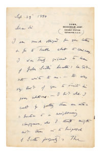 recommandation de Darwin, avait dirigé le Jardin Botanique Royal de Calcutta, à la tête duquel George KING (1840- 1909) lui avait succédé en 1871. Scott avait mené de nombreuses expériences pour le compte de Darwin. Le 28 septembre, King avait informé Darwin du décès en Écosse (le 11 juin) de leur collègue John Scott, ajoutant qu'il était en possession des papiers de Scott et qu'il lui envoyait deux cochons conservés, présentant un phénomène héréditaire, que Scott avait destinés à Darwin. Darwin avait été prévenu du décès, le 17 juin, par l'oncle de Scott. Il évoque ici son dernier ouvrage, publié en octobre 1881 : The formation of vegetable mould, through the action of worms.] Darwin a été profondément attristé d'apprendre la mort de John Scott. Il est touché que King ait rendu visite à cette pauvre famille. Il avait fait ce qu'il avait pu pour aider la famille pour la succession de Scott. La famille voulait qu'il aille là-bas ; mais il est très faible et le voyage était beaucoup trop long pour lui. Il aimerait beaucoup avoir le plaisir de faire la connaissance de King, qu'il invite à venir dîner et dormir chez lui, indiquant l'itinéraire par le train depuis la gare de Charing Cross à Londres jusqu'à Orpington. Il est en train d'écrire un petit essai sur l'action des vers, et les informations que l'enquête de King lui a fournies se sont révélées précieuses. Il avait oublié, avant de relire attentivement toutes ses notes, l'immense peine que King avait si aimablement prise pour lui... « I am much obliged for your letter & for the trouble about the specimens. I was truly grieved to hear of John Scott's death: he did not write to me. - It was very kind of you to visit his poor relatives. - I did what I could by getting them an introduction to a neighbouring clergyman, who I thought might aid them in the dispatch of Scott's property. They wanted me to go down there; but I have very little strength & the journey was much too long for me. - I had not heard before receiving your note that you were in England. I should very much like to have the pleasure of making your personal acquaintance. Can you spare the time to come here to dinner & sleep any day soon, which would suit you? [...]If so, you had better leave Charing Cross for Orpington St. by the 4o5' train or 5o.5' if more convenient. I shd. almost certainly be able to send you a carriage to meet you at the Station & take you back next morning. Please observe that the Trains may possibly be changed on Oct 1st. I hope that you may feel inclined to come.— & if so be so kind as to let me hear. I am now writing a little Essay on the action of worms, & the information which your survey gave me has proved invaluable. - I had forgotten, until carefully going over all your notes, what immense trouble you had so kindly taken for me »...