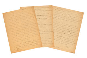 [Raymond et Lucie Aubrac consacrèrent dès 1940 tout leur temps libre aux activités de la Dernière Colonne, mouvement résistant créé par Emmanuel d'Astier de La Vigerie alias Merlin. En mai 1941, ils aidèrent « Merlin » à fonder le journal qui marquait la naissance du mouvement Libération. Enfin, en 1943, d'Astier entra au CFLN (Comité français de Libération nationale) en tant que commissaire à l'Intérieur.] Dans cette lettre, Aubrac se montre optimiste quant au devenir du CFLN. Il apparaît, comme de Gaulle, hostile à toute forme de « politique politicienne » qui empêcherait la démocratie de fonctionner de manière optimale. Il se montre ensuite partisan de l'élimination de Pierre PUCHEU (premier membre du régime de Vichy à être exécuté avant l'Épuration) - et de Marcel PEYROUTON (ministre de l'Intérieur de Pétain), ainsi que de Pierre LAVAL. La fin de la lettre mentionne, non sans un certain humour, les primes respectives pour la capture d'Aubrac et d'Astier. « Partout, dans toutes les classes sociales dont le rassemblement réel est peut-être la caractéristique la plus importante de nos mouvements, une grande confiance, ou plutôt un grand besoin de confiance dans le CFLN. [...] Répondant à une anxiété certaine créée, il faut bien le dire, par la propagande ennemie, les positions respectives du CFLN et du parti communiste ont été heureusement et d'une manière vivante définies par le court dialogue public du Commissaire à l'Intérieur et de Fernand Grenier. [...] Le plus grand reproche que font à Alger les hommes de la résistance, et aussi tous les Français, c'est de ressusciter des personnages politiques et des préoccupations partisanes d'un autre âge. La France veut la démocratie. Mais sauf les professionnellement intéressés, personne n'admet que la démocratie consiste en dosages de partis dont le moins qu'on puisse dire, c'est qu'au moment où la France a eu le plus grand besoin de penser, d'agir et de combattre, ils étaient absents. [...] La lenteur de la “purge” effraie mes amis et gonfle d'espoir nos adversaires. Qu'attendez-vous pour exécuter Pucheu & Peyrouton ? Est-ce que Monsieur Pierre Laval sera simplement admis à faire valoir ses droits à la retraite ? »... Quant à ses « petites affaires personnelles » et les « échos de la famille », il annonce que « Babou attend une petite soeur [...] Sa mère est tout à fait furieuse d'accoucher en plein maquis [...]. La layette du futur enfant provient tout entière de la charité de la résistance. Mes parents sont arrêtés [...] Après cette naissance, je tacherai d'installer la petite famille dans un coin tranquille. J'insisterai pour que la mère de famille (qui est très activement recherchée) ne s'occupe plus que d'élever ses gosses [...] L'A.S., qui s'est assez étendue à la base, est à la tête entre mauvaises mains. Je ne sais si la situation peut être très améliorée dans les circonstances actuelles. Il faudrait là, comme ailleurs aussi, un durcissement des cadres et un grand effort de discipline - et naturellement pousser à l'action immédiatement tous ceux qui le peuvent - peut-être imposer partout un pourcentage de transferts aux groupes francs [...] J'aurais aimé reprendre quelqu'activité avec ces gens là, mais on me dit de toutes parts que c'est peu sage, mes fiches anthropométriques ayant été répandues à de très nombreux exemplaires par la Gestapo et une prime de 2.000.000 attachée à ma prise (au fait vous en valez 5 qu'on m'a offert pour vous “donner” »... PROVENANCE Bibliothèque Dominique de VILLEPIN. Feux et flammes, II Les Porteurs de flammes (29 novembre 2013, n° 482).
