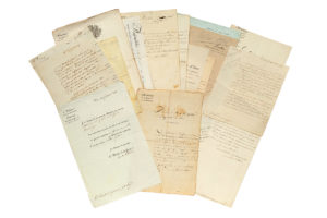 « G. Clarke » comme général, directeur du Cabinet topographique et historique militaire du Directoire exécutif, au général Montesquiou. 1808 (signée « Clarke »), et 1811-1817 (signées « Le Duc de Feltre », puis à partir de juillet 1816 « Le Mal D. de Feltre »), comme ministre de la Guerre, nominations, promotions, lettres de service, etc., et 3 brevets sur vélin.