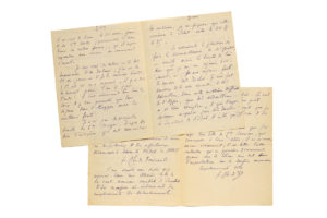 commandant cet été à Tamanrasset, et parle de son dictionnaire touareg-français : « le dictionnaire ne sera, je le crains, pas fini avant le mois d'août & je resterai ici jusqu'à son achèvement ». Il se réjouit de l'amélioration de l'état de santé de son ami le colonel LAPERRINE, et parle de divers officiers, en poste ou en mission dans l'Ahaggar et l'Ajjer, dont le capitaine GARDEL... Puis il évoque le projet de chemin de fer Transsaharien : « Le chemin de fer transformera tellement les choses sous le rapport commercial, & sous bien d'autres, & il rendra si nécessairement, par la force des choses, son propre tracé la ligne commerciale principale, la seule grande ligne, suivie par les caravanes les plus importantes, qu'à mes yeux, il n'y a plus d'utilité à chercher à faire prendre telle ou telle route par la caravane. Toutes les lettres que je reçois de France sentent la poudre à un degré tel que je me figure que ce chemin de fer se fera très vite : la rapidité de construction est une question de volonté; car la facilité du travail est telle, entre Colomb Bechar & Agadez que, si l'on veut, cela peut aller très vite; l'existence de ce chemin de fer serait d'une telle importance, en cas de guerre européenne, non seulemt pour la défense de notre empire africain, mais pour la possibilité de porter le maximum de forces sur le Rhin, que j'imagine qu'on travaillera vite »... Le pays est « dans son calme habituel. La récolte continue à s'annoncer belle. Mais, hélas, il ne tombe pas une goutte de pluie ». Il a reçu une lettre du capitaine Berriau, commandant à Beni- Abbès, laissant « entendre qu'en prévision d'événements graves sur le Rhin on reste dans l'expectative sur les confins marocains »... En haut de chaque page, il a dessiné un coeur surmonté de la croix avec le nom de « Jésus ». PROVENANCE Bibliothèque Dominique de VILLEPIN. Feux et flammes, I Les Voleurs de feu (28 novembre 2013, n° 90).