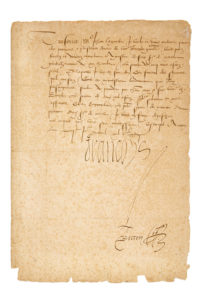 FRANÇOIS Ier (1494-1547). P.S. « Francoys », Caen 14 avril 1532 ; contresignée par son secrétaire des finances Jean BRETON (1490-1542) ; 1 page petit in-fol. (papier lég. bruni, un peu effrangé dans le bas). Ordre au trésorier Jehan LAGUETTE...