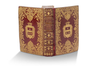 Chouans du XVIIIe : « Bon de Cent livres » Remboursable au Trésor Royale, de l'Armée Catholique et Royale de Bretagne. Avec un retirage “A La tête noire” en regard. Agréable almanach de la première année révolutionnaire. Maroquin rouge de l'époque, dos à nerfs orné, plats ornés à la plaque aux petits fers dans le goût de l'époque, armes dorées poussées au centre. Aux armes non identifiées, “aux 2 taons et une étoile en chef”. Restauration visible, et elle-même légèrement frottée, du mors supérieur.