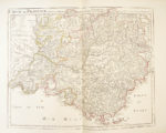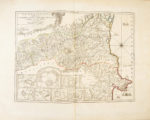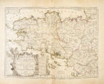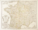 vert titrées en or « Atlas » et « La France » au dos, large dentelle dorée en encadrement des plats avec vases fleuris dorés en écoinçons, armes du Roi de Naples et de Sicile dorées frappées au centre des plats, double filet doré sur les coupes, roulette intérieure dorée, contreplats et gardes de papier doré et gaufré, tranches dorées. Superbe Atlas de la Bibliothèque du roi de Naples et de Sicile (Maison de Bourbon-Sicile), Charles III d'Espagne ou bien son fils Ferdinand IV de Naples, aux grandes armes frappées au centre des plats. Composite, orné de 45 cartes sur papier fort, la plupart doubles ou dépliantes, offrant une illustration détaillée de Paris, du Château de Versailles, des régions et de plusieurs villes du Royaume de France. Ouvrage entièrement monté sur onglets. L'atlas ne comporte pas de titre. Seul un feuillet manuscrit de table est relié en début de volume. Les cartes, datées entre 1695 et 1757, sont signées de Delisle (rééditées par Buache), Jaillot, l'abbé Delagrive, de Fer, Nolin, et Beaurain. Rehaussées de couleurs aux frontières et limites pour la plupart, à l'exception notamment des plans de villes de Beaurain. Plusieurs cartes sont ré-imposées au format de l'ouvrage, offrant ainsi un ensemble harmonieux et cohérent. Une carte légèrement brunie. Infimes défauts.