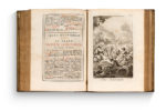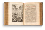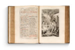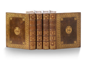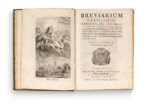 volumes au format in-4 (20,5 x 26 cm). Très beau maroquin bistre de l'époque aux armes de veuve de la duchesse d'Orléans, femme du Régent (OHR, 2567, fer n°7). Gravures en noir, texte en colonnes encadré imprimé en rouge et noir. A belles marges, bandeaux gravés, vignette gravée, 2 feuillets de plain-chant à notes carrées pour chaque tome. Guirlande à rinceaux dorée de type “bordure du Louvre” sur les plats, soulignée d'une roulette à fleur de lys, fleur de lys en écoinçons, armes aux centres, roulette dorée aux contreplats, double filet doré sur les coupes, tranches dorées, dos à nerfs orné de caissons fleurdelisés dorés, guirlande dorée en pied, pièces de titre et de tomaison de maroquin fauve, titre doré. Reliure exécutée entre 1736 et 1740, semble-t-il avec divers matériaux de dorure faits pour la Bibliothèque du Roy depuis la fin du XVIIe, notamment pour la “bordure du Louvre” autorisée par Colbert ou la roulette des contreplats (Christie's, Vente Michel Wittock II, 2004 et Métivier, La Reliure à la Bibliothèque du roi de 1672 à 1786). Première et grande édition du bréviaire selon le Rite parisien promulgué par l'archevêque de Paris, Charles de Vintimille du Luc (1655-1746) aux grandes armes en bois gravé reprises au titre. Il deviendra la référence des diocèses français au XVIIIe. Complet des 12 eaux-fortes : 4 frontispices et 8 planches, gravés par Lebas (1707-1783) d'après les compositions du peintre François Boucher. Les frontispices représentent une allégorie devant un monument : la Foi devant les Invalides (printemps) ; l'Espoir devant le Louvre (été) ; la Pitié devant le Pont neuf (automne) ; la Religion devant Notre Dame (hiver). PROVENANCE Bibliothèque de Françoise-Marie de Bourbon dite Seconde Mlle de Blois (1677-1749)-fille légitimée de Louis XIV et Mme de Montespan - duchesse de Chartres puis d'Orléans par son mariage avec Philippe d'Orléans. Au décès de celui-ci en 1723, elle prit le titre de Duchesse douairière et vécut au Palais-Royal jusqu'à sa mort. M. Duhamel, vicaire de Saint-Maclou, à Pontoise. Seine et Oise avec son ex libris imprimé contrecollé aux gardes-Collection Michel Wittock avec son ex libris de basane rubis et frappé doré. Notes et vers manuscrits anciens à l'encre brune : “Cantique du temps de l'Avent” et “Ad Laudes. Canticum pro tempore quadragesimae” sur des gardes... Quelques rousseurs et brunissures légères, quelques griffures ou très fines épidermures aux plats et petits frottements à quelques endroits sensibles. Coins légèrement frottés. Discrètes petites restaurations. Petites traces ou frottements des ors sur les plats en quelques endroits. Petits manques à 3 pièces de titre et tomaison. Une petite déchirure latérale sans manque au f. CCii de Pars Hiemalis.