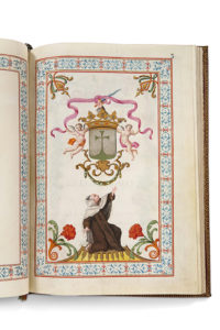 S. L. Metis. 1757. [Metz]. [Manuel des offices divins pour les Carmes...]. Au format petit in-folio (26 x 35,5 cm). 58 pp. manuscrites à l'encre sur grandes feuilles de vélin préparées, numérotation suivie à l'encre, dont 5 pp. restées vierges portant seulement la préparation de l'encadrement au pochoir. Complet. Maroquin rouge de l'époque orné à la Duseuil, dos à nerfs orné de caissons fleuronnés dorés, plats ornés d'un double encadrement de dentelles dorée aux petits fers, au pointillé et aux fleurs de lys en écoinçons pour la plus large, soulignées de double filet doré, fleurs en écoinçons vers l'extérieur, joli fer floral poussé en doré au centre des plats, roulette dorée aux coupes et contreplats, tranches dorées, gardes de papier dominoté étoilé d'or, grands signets de soie de couleurs. Collectaire manuscrit enluminé sur vélin dans un maroquin de l'époque. Destiné à la communauté des Carmes déchaussés de Metz autour de 1750-1760. Destiné au rituel de l'ordre des Carmes, probablement réalisé dans la période d'uniformisation liturgique et de réalignement canonique pour le clergé régulier au XVIIIe, en France autant qu'à Metz, notamment aux initiatives de Claude de Saint-Simon, évêque de la ville jusqu'en 1760. DESCRIPTION : Pages de 14-15 lignes d'une écriture en lettres rondes, calligraphiées dans un encadrement à motif floral de couleurs fait au pochoir et souligné de doubles filets grenat et doré. Rédigé en latin avec quelques phrases en français. Un certain “Christophorus” est cité “Excudebat” à la page de titre donc “imprimeur” du fait des vélins préparés au pochoir. Avec une grande figure peinte en frontispice représentant un carme en habit, en adoration sous le blason de l'Ordre du Carmel déchaussé surmonté de l'épée flamboyante de la victoire d'Elie suivie d'une page de titre ornée. Une seconde figure peinte avec une carmélite en habit en adoration à mi-page (pp. 24). Avec 34 très jolies lettrines (ca 5 x 6 cm) délicatement paysagées, parfois avec de petites figures, peintes avec rehauts et encadrement à l'or liquide, évoquant les moments de la journée ou saisons de l'année. Texte manuscrit alternativement en lettres d'or, rouges, bleues et brunes, inscrit dans un riche encadrement doré et rehaussé à la gouache composé d'un treillage et de motifs rocailles. Très beaux culs-de-lampe peints à motifs floraux ou grands bouquets. Les pp. 42-58 qui terminent l'ouvrage sont très certainement d'une main différente pour l'écriture et les lettrines, de moindre habileté, peut-être réalisées plus tard dans le temps. Très légère rétractation du vélin provoquant quelques irrégularités des feuilles, coins un peu usés, quelques discrets défauts d'usage mais bel exemplaire. CONTENU Recueil des oraisons et prières devant être prononcées pour suivre le rituel et les offices. Se succèdent : Antiphonia pro Sabbatis..., Pro Aspersione et Tempore Paschali, Orationes..., les In Festo, In die Sancto, In Solemni.., In festo.. et contient 2 prières, des frères convers et frères novices, rédigées en français. Anonyme, ce manuscrit ne porte aucune mention de peintre ou calligraphe ni aucune marque de provenance hormis ses récipiendaires. ORIGINE La communauté nommée au titre est sûrement celle dite aujourd'hui de Saint Éloi, à Metz, située dans l'Ancienne ville avant la Révolution. Une traduction de langage pouvant évoluer dans le temps ainsi que l'absence d'autres communautés de carmes ou de “communauté de Saint Elie” à Metz à cette époque confirmeraient le lien de ce manuscrit avec la communauté des Carmes Déchaussés de Metz sise sur (l'ancienne) maison Saint-Eloi au XVIIIe. Les “Carmes Déchaux” de Nancy s'installent en 1644 sur la colline Sainte-Croix, à l'emplacement de la maison Saint-Éloi fondée par les Jésuites, non loin de l'ancien ghetto de la ville. L'actuelle Eglise des Petits-Carmes y est alors construite entre 1650 et 1675 et un cloître y est avéré dès 1707. La communauté des femmes, les carmélites de Metz ont produit des manuscrits aujourd'hui conservés dans des collections publiques. Nous émettons l'hypothèse que ce sont celles-ci qui ont ellesmêmes rédigé ce superbe ouvrage à l'intention des Carmes de Metz et de leurs obligations liturgiques justifiant d'autant mieux la présence d'une figure peinte de carmélite en adoration.