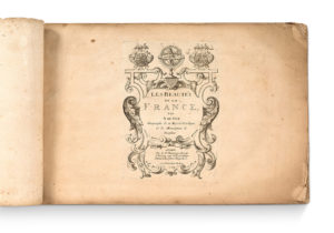 DE FER, Nicolas. Les Beautés de la France. À Paris, chez le Sieur Danet, gendre de l'auteur, 1724. In-4 oblong (27,2 x 42 cm), 96 ff. gravés sur cuivre (dont titre, 30 ff. de texte et 65 pl.), cousus sous couverture d'attente de papier marbré. Il...