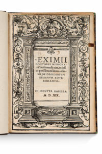 noir. Demi-maroquin brun postérieur, dos lisse, auteur, titre et date dorés au long du dos, double filet à froid sur les plats. Édition latine post-incunable d'Érasme, de sa biographie de St Jérôme “La vie de l›excellent docteur Hiéronymus de Stridon, compilée principalement à partir de ses propres lettres” dont il étudiait et retranscrivait les écrits. Ornée d'une belle page de titre à portique proche du style grotesque, gravée sur bois, suivie d'une page comportant une grande et belle lettrine à figures avec le texte dans un encadrement ornemental, également gravé sur bois. Quelques rousseurs marginales, marges légèrement courtes (sans manque).